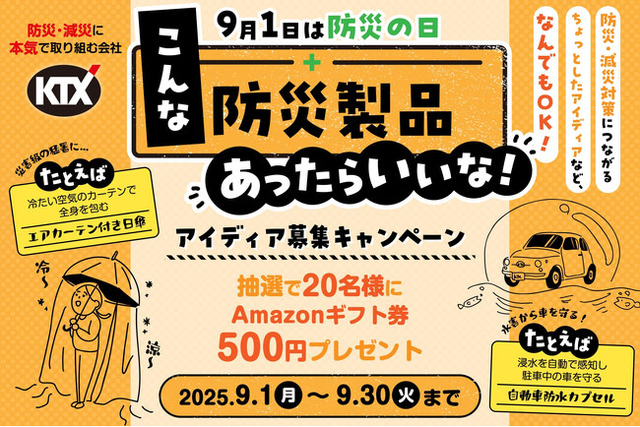 「止水板」「耐震シェルター」などの『防災・減災製品』の開発に取り組むKTX株式会社(本社:愛知県江南市、代表:野田 太一)では、異常な夏の高温や頻発する極端な豪雨などにより、自然災害(気候変動)への備えを強化していく必要性に迫られている今、“防災への備え”を考えていただくきっかけとして、“こんな防災製品あったらいいな!” をテーマにアイディア募集のキャンペーンを9月1日から開始いたします。