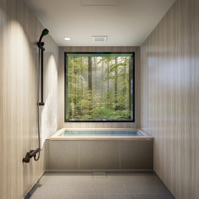 檜と十和田石を組み合わせた浴槽を標準仕様とし、価格を抑えながらも贅沢な素材感を実現。