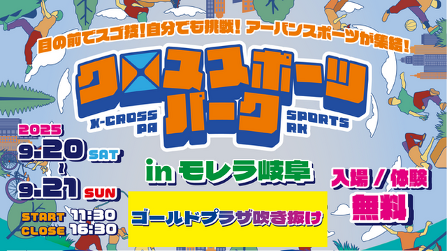 株式会社MoveX(本社:東京都品川区)は、プロの圧巻パフォーマンスと多彩なスポーツ体験を無料で楽しめるイベント「クロススポーツパーク in モレラ岐阜」を、2025年9月20日(土)・21日(日)の2日間、モレラ岐阜(岐阜県本巣市)にて開催します。