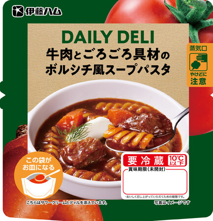 伊藤ハム株式会社は、「DAILY DELI」シリーズより、「牛肉とごろごろ具材のボルシチ風スープパスタ」「若鶏とごろごろ具材のクリームスープパスタ」「生姜香るもち麦入り参鶏湯」「フォー入りうま辛麻辣湯」の4品を発売します。