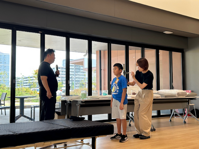 続いて、当社の「オーダーメイド枕 まくらぼ」の体験では、各グループの代表が測定を行い、枕の高さや素材によって眠り心地が変わることを体感。子どもたちは、自分に合った寝具を選ぶ大切さに気づき、日々の暮らしを見直すきっかけとなりました。