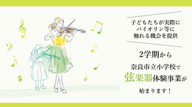 奈良市では、令和7年2学期から奈良市立小学校の児童を対象に、バイオリン等の弦楽器体験事業を試行的に実施します。小学校で普段、取り組む機会が少ない弦楽器。実際の楽器を試奏し、目の前でプロによる生演奏を鑑賞することで、子どもたちの音楽を愛する心や音楽に対する感性をより豊かに育むことを目指します。