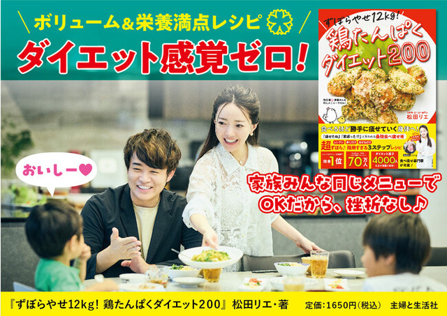 松田自身も2児の母。産後も体型をスムーズに戻せたのは、“鶏たんぱく”を中心とした瞬食レシピのおかげ。「子どもが喜ぶ唐揚げ風レシピ」「夫のおつまみにもなるヘルシーおかず」「簡単小鉢」など、家族の“美味しい!”と自分の“痩せたい!”を両立できる200品を掲載しました。