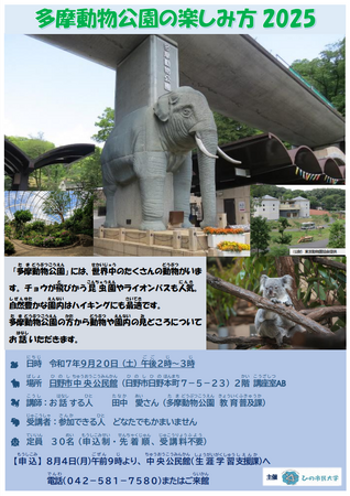 本講座では、多摩動物公園の方から、動物たちや園内の見どころなどについてお話いただ