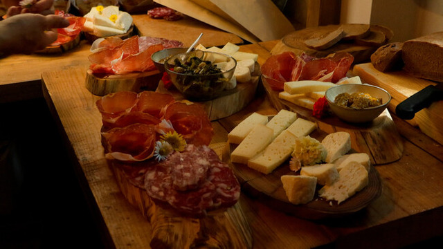 この日はイタリアの開放記念日、オープンテラスは予約で満席だ。 ランチメニューは、前菜は、トーマチーズ(牛とヤギのミルクのミックス)とサラミ、メインはラグーのラザニアとイラクサのペーストと有機リコッタチーズのラヴィオリだ。 澄んだ青空の下、村人は最高のひとときを楽しんでいる。