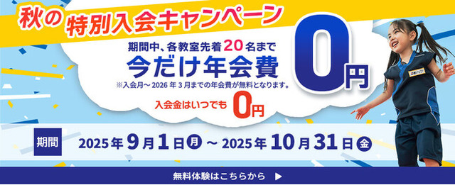 総合教育サービス企業の株式会社やる気スイッチグループ(東京・中央区、代表取締役社長:高橋 直司)が展開する幼児・小学生向けスポーツ教室「忍者ナイン(R)」 では、2025年9月1日(月)から10月31日(金)までの期間中、「秋の特別入会キャンペーン」を全国の教室で実施します。入会金0円に加え、2026年3月までの年会費も0円になるキャンペーンで、お子さまに「この秋にスポーツに挑戦させたい」「新たな習い事にチャレンジさせたい」といったご家庭を応援します。本キャンペーンは各教室で先着20名限定(※2・※3)です。