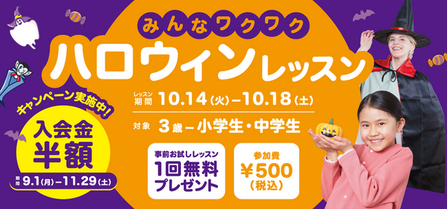 総合教育サービス企業の株式会社やる気スイッチグループ(東京・中央区、代表取締役社長:高橋 直司)が展開する子ども向け英語・英会話スクールのWinBe(R)(ウィンビー)は、3歳~中学生のお子さま向けのハロウィンレッスンを2025年10月14日(火)~18日(土)に開催いたします。また、入会をご希望の方には大変お得な入会金半額キャンペーンを9月1日(月)~11月29日(土)まで実施しております。