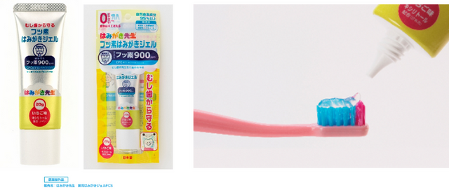 フッ素はみがきジェルの他にも、0才から使うことができる指サックや、1才から9才までの「歯ブラシ」、18ヶ月から12才までのお子様の歯間の汚れを取る「フロス」、18ヶ月から使えて習慣的なみがき残しが分かる「2色染めはみがきジェル」を展開しています。