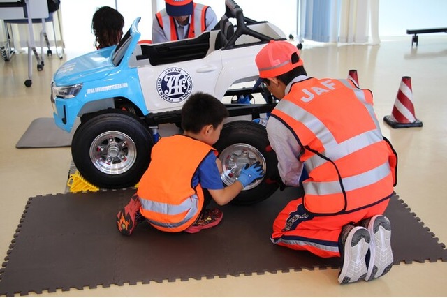 子どもがJAFロードサービス隊員の指導を受けてタイヤ交換作業を体験する「子どもロードサービス検定」