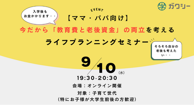株式会社ガクシー(本社:東京都港区、代表取締役:松原良輔、以下 ガクシー)が運営する日本最大級の奨学金プラットフォーム「ガクシー」は子育て世代の皆様(特に大学生前後のお子様をお持ちの方)を対象に、「教育費と老後資金から考えるライフプランニング」無料オンラインセミナーを開催いたします。今年7月に行った第1回が大変好評につき、さらにブラッシュアップして第2回を開催します!