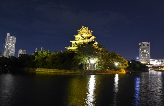 2024年 世界小児がん啓発キャンペーンでゴールドにライトアップされた広島城
