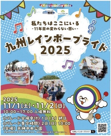 九州レインボープライド実行委員会(代表:三浦暢久)は、 「私たちはここにいる!」ー11年目の変わらない想いー をテーマに、11回目となる【九州レインボープライド2025】を2025年11月1日(土)・2日(日)に福岡市天神中央公園にて開催いたします。