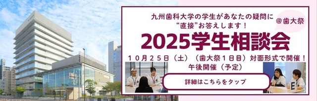 公立大学法人 九州歯科大学(キャンパス:福岡県北九州市、理事長・学長:粟野 秀慈)では、本学をより詳しく知って身近に感じてもらうことを目的として開催している「WEBオープンキャンパス」のプログラムの1つとして実施している、高校生・受験生を対象とした「2025学生相談会」を、九州歯科大学の大学祭「歯大祭」の1日目にあたる2025年10月25日(土)に、対面形式で実施することが決定しました!