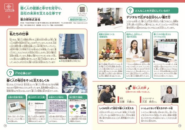 弊社の掲載ページでは、勤次郎のシステムの仕組みや健康経営への取り組み、システム開発やコンサルティングを担当する社員へのインタビューを掲載。仕事のやりがいや楽しさを伝えることで、IT業界の仕事を身近に感じてもらえるよう工夫しています。また、弊社の本社がある千代田区の小学校への協賛を通じて、地域の子どもたちに弊社の活動や仕事を知ってもらう機会にもなっています。子どもたちが将来を考えるきっかけを提供し、働くことや多様な働き方への理解を深めることに役立てていただければと考えています。