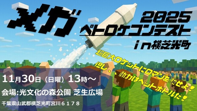 2025年11月30日(日)、千葉県横芝光町「光文化の森公園 芝生広場」にて、全長4m級の巨大ペットボトルロケットを水平飛距離で競う「メガ・ペトロケコンテスト in 横芝光町」の開催が決定しました。子どもから大人まで楽しめる科学×エンタメの新競技が、関東で初めて開かれます。