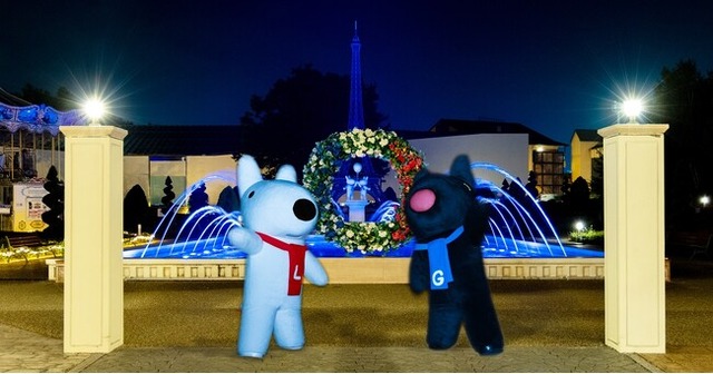 フランス・パリの街角をモチーフにした「リサとガスパール タウン」は、日没とともに刻々と表情を変えます。噴水のきらめき、街灯やイルミネーションが織りなす光の演出は、まるで絵本の1ページをめくるような幻想的な世界へと誘います。