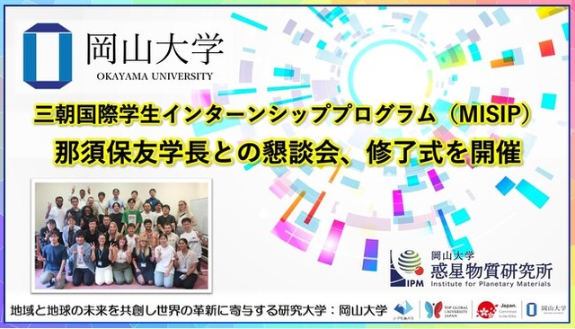 国立大学法人岡山大学(本部:岡山市北区、学長:那須保友)の高等先鋭研究院を構成するひとつである岡山大学惑星物質研究所(鳥取県三朝町)は2025年8月4日、「三朝国際学生インターンシッププログラム(MISIP;Misasa International Student Internship Program)」の一環として、那須保友学長との懇談会を開催しました。