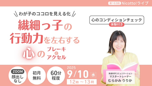 今回のNicotto!ライブでは、HSC繊細な子の心と脳を育てる専門・発達科学コミュニケーションマスタートレーナーであり、『HSC・繊細な子の育て方がわかる!ペアレントトレーニング』(パステル出版)著者である むらかみりりかが登壇。独自に開発した「ココロファインダー」を用いて、子どもの心理状態を5つの指標で数値化できる「心のコンディションチェック」を解説し、子どもの行動力を引き出すための具体的なアプローチを紹介します。