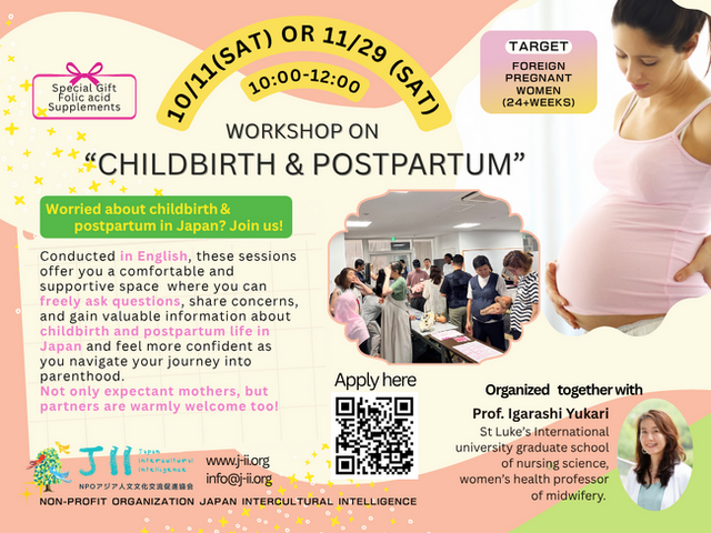 特定非営利活動法人アジア人文文化交流促進協会(東京都目黒区、理事長 石川憲彦)(以下、JIIという)は、外国人妊婦とそのパートナーを対象に、聖路加国際大学にて英語で「出産・産後ワークショップ」を2回(2025年10月11日(土)、11月29日(土))開催します。本ワークショップは、聖路加国際大学大学院看護研究科教授であり異文化看護を専門とする五十嵐ゆかり氏を講師に迎え、日本の病院での出産事情、出産の流れ、医療機関との連携、産後の身体の変化や赤ちゃんとの生活、パートナーの支援の在り方などを実践的に学べます。妊婦ご本人はもちろん、パートナーの参加も推奨しており、外国人妊婦も日本で安心して出産・育児を迎えられるよう支援します。