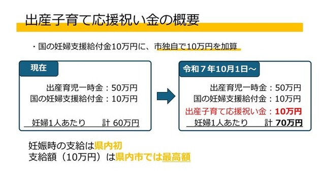 ●妊娠時に国の妊婦支援給付金5万円と出産子育て応援祝い金5万円の合計10万円を支給●出産時に国の妊婦支援給付金5万円と出産子育て応援祝い金5万円の合計10万円を支給