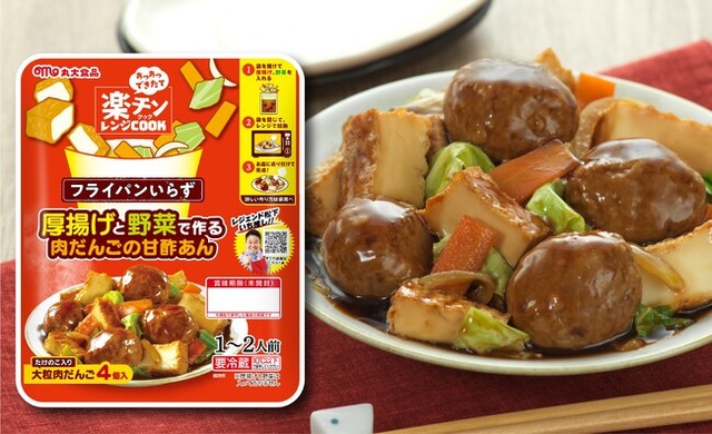 調理はコンロから電子レンジへ。簡便化志向はさらに拡大しており、レンジ調理商品の需要が高まっています。レンジ調理商品の市場規模はここ数年で大きく伸長しており、今後も成長が見込まれています。また、ワーキングママや単身世帯も年々増加してお り、家庭内で一人で食事をとることも増えてきております。楽チンレンジCOOKは大粒肉だんご4個と甘酢たれ入りの商品で、ジッパーを開け、袋に厚揚げと野菜を入れて電子レンジで温めるだけで、簡単にボリュームたっぷりな手作り感のあるできたて料理を作ることができます。“毎日仕事や家事をがんばる自分のため、愛する家族のために「楽チンだけど手作り感のある、あつあつ、できたて料理」をご家庭で簡単に作っていただきたい”という想い から発売した商品です。また、他社に多いたれのみのレンジ調理商品とは違い、加熱済みの大粒肉だんごが入っているので、追加で肉具材を用意する必要もなく、中の肉具材の火通りを心配する必要がない点もご好評いただいております。平置き状態で加熱することで加熱ムラの防止効果もあり、野菜の食感よくボリューム感のあるおかずが出来上がります。