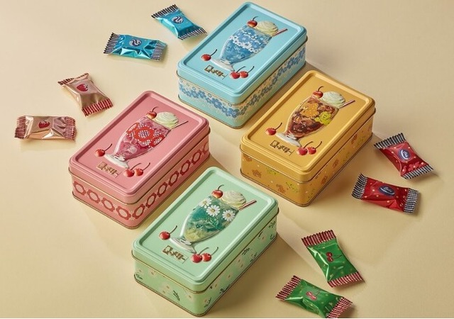 「メリーチョコレート はじけるキャンディチョコレート。」サイダー缶(花の輪)、メロンクリームソーダ缶(野ばな)、いちごソーダ缶(花だん)、コーラフロート缶(ズーメイト)(各9個入り)各1,296円【阪急うめだ本店先行販売】