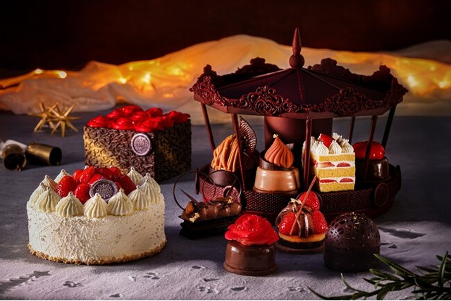 クリスマスケーキのラインナップは、本物のように回転する精巧なチョコレートのメリーゴーラウンドの上に、見た目も味も異なる8種類のケーキが乗った、子どもも大人も心躍る、シェフパティシエの遊び心が光る「メリーゴーラウンド」、9本の薔薇の花言葉「いつまでも一緒にいたい」を込めた、大切な方との時間を演出する「ショコラローズ」、甘酸っぱいイチゴとこだわりのフロマージュブランクリームで仕上げたショートケーキ「ロイヤルショート」。
