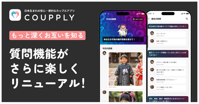 COUPPLY株式会社(所在地:大阪府堺市、代表:白水康誠)は、2025年6月17日にリリースした夫婦・カップル向けのコミュニケーションアプリ『COUPPLY(カップリー)』において、日々の会話をより楽しく、より深くする「質問機能」をリニューアルいたしました。