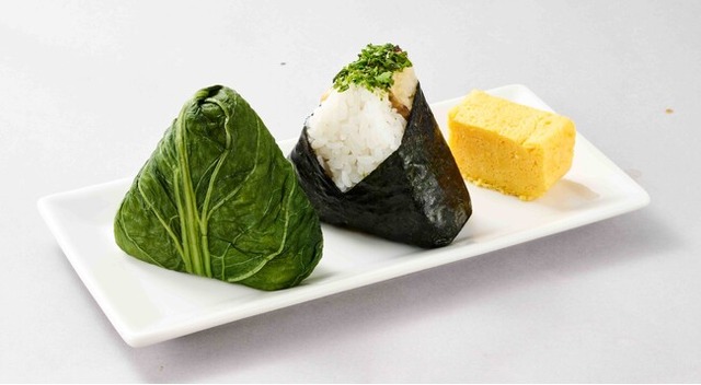 高菜で包んだおむすびの中には、西京白味噌と炭火焼き鶏が