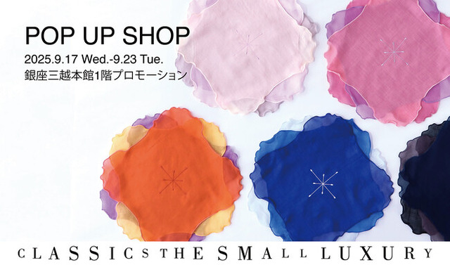 CLASSICS the Small Luxury (クラシクス・ザ・スモールラグジュアリ)は、東京、日本橋人形町を拠点に日本のハンカチーフ業界のパイオニアである、繊維製品企画販売のブルーミング中西株式会社(本社 東京都 中央区 取締役社長 中西一) が運営するハンカチーフ専門店です。この度、2025年9月17日(水)~9月23日(火・祝)まで、銀座三越にてPOP UP SHOPを開催します。