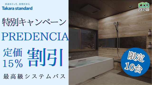 リプレ株式会社(本社:大阪市中央区、代表:古川 賢)は、タカラスタンダードの最高級グレード システムバス「PREDENCIA(プレデンシア)」の特別キャンペーンを実施いたします。