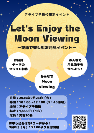 株式会社アライブ(愛知県名古屋市、代表取締役:三井博美)が運営するアライブイングリッシュスクール千種校では、2025年9月23日(祝・火)に園児・小学生を対象としたイベント「Let’s Enjoy the Moon Viewing ‐英語で楽しむお月見イベント‐」を開催いたします。