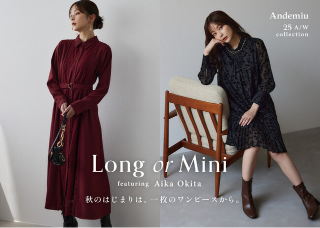 Andemiuの人気アイテム「レース切り替えワンピース」と「大人ミニワンピース」に新作が加わります。日常の食事会やデートはもちろん、カジュアルアイテムとのミックススタイリングなど、幅広いシーンでアレンジを楽しめる一着です。上質でありながら抜け感のあるロングワンピースと、視線を惹きつける軽やかなミニワンピースは、それぞれが大人の秋を感じさせ、沖田愛加さんが身にまとうことで、モードとフェミニンの間を漂う新たな魅力が一層際立ちます。