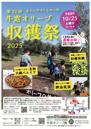 オリーブ栽培とオリーブの木・食品・化粧品の製造販売を手掛ける日本オリーブ株式会社(所在地:岡山県瀬戸内市牛窓町、取締役社長:服部芳郎)は2025年10月25日(土)、瀬戸内海を一望できる自社牛窓オリーブ園にて、第32回牛窓オリーブ収穫祭2025「オリーブづくしの一日」を開催いたします。