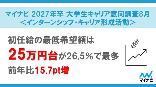 株式会社マイナビ(本社:東京都千代田区、代表取締役 社長執行役員:土屋芳明)は、2027年卒業予定の全国の大学生、大学院生を対象に実施した、「マイナビ 2027年卒 大学生キャリア意向調査8月<インターンシップ・キャリア形成活動>」の結果を発表しました。