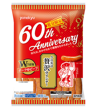 米久のフラッグシップ商品「御殿場高原あらびきポーク」をベースに「牛肉と牛脂」を加え、ポーク&ビーフのWのうま味を楽しめるリッチなウインナーを発売。米久の60周年に相応しく、赤いちゃんちゃんこを着たよねきゅうのソーセージおじさん※が商品パッケージに登場。【ポイント3】数量限定 発売