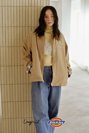 ブルゾンは「Dickies(R)」の古着アーカイブをベースに、身頃には厚手のコットン生地を、襟にはコーデュロイを使用し、素材ミックスやバイカラーデザインが特徴。裏地のチェック柄などの“こだわりポイント”が、着用時に気分を高めてくれるデザインです。さらに、袖をまくったときにさりげなく覗く裏地が、スタイリングにアクセントを添え、おしゃれ感を引き立てます。