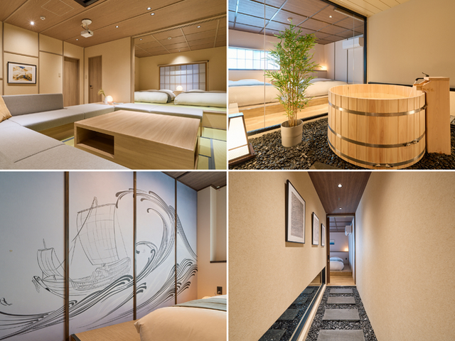 今回開業する「今昔荘 大阪 天保山 -米商・魚商-」は、こうした歴史をコンセプトに、物流会社マグチグループの旧事務所ビルを改装して誕生しました。浴槽やアートワークなど随所に歴史を感じていただけます。米商の空間には米俵や穀物をモチーフにして温かみを、魚商をイメージした空間には、伝統文様などを通して表現された海を感じる装飾を採用しました。また、今昔荘の特徴でもある浴室も、このテーマに合わせ、訪れるゲストが五感で日本の文化を感じられる空間を演出しています。