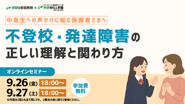株式会社 学研ホールディングス(東京・品川/代表取締役社長:宮原博昭)のグループ会社、株式会社 学研エル・スタッフィング(東京・高田馬場/代表取締役社長:伊藤弘雅)は、展開する「学研WILL学園」「学研の家庭教師訪問支援室」で数多くご相談をいただいている不登校・発達障害への見識を深めていただくため、2025年9月26日(金)と9月27日(土)に「中高生への声かけに悩む保護者さまへ~不登校・発達障害の正しい理解と関わり方」無料オンラインセミナーを開催いたします。
