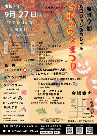 特定非営利活動法人くるくるネット(理事長:鳥山晃)は、令和7年9月27日(土)に「第17回クルハウスまつり」を開催いたします。今回はハロウィンスペシャルとして、地域の子どもから大人まで楽しめる多彩なプログラムを用意しました。