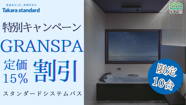 リプレ株式会社(本社:大阪市中央区、代表:古川 賢)は、タカラスタンダードのスタンダード システムバス「GRANSPA(グランスパ)」の特別キャンペーンを実施いたします。