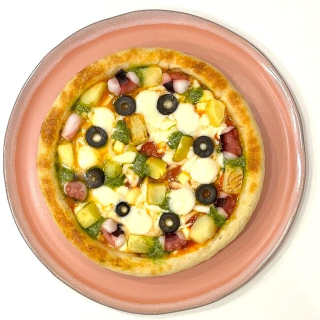 蛸とジャガイモの地中海風ピザ トマトソースに蛸とジャガイモのグリルをトッピング。バジルソースとブラックオリーブがアクセント。