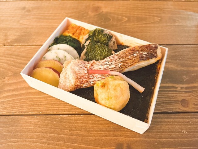 〇海苔弁 「熊本県 宇土天草の食」天草市など自治体などからも協力を受け完成まで1年強。香り高い熊本県宇土市の有明海苔はもちろん、空輸で毎日仕入れる本来刺身で食べられる活鯛(みやび鯛)を塩焼に、天草の山間地で作られる新米(天草五つ星米)など、全てのおかずに熊本の食材が使用されています。