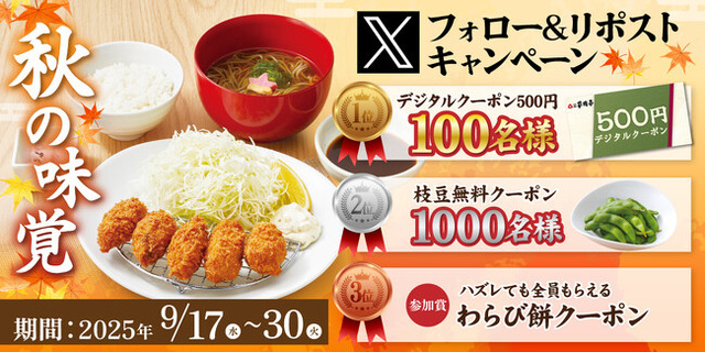 株式会社家族亭(本社:大阪府大阪市、代表取締役執行役員社長: 坪山憲司)が運営するそば和食チェーン「家族亭」は、2025年9月17日(水)午後8時~9月30日(火)の期間に、家族亭公式Xにて、フォロー&リポストキャンペーンを開催いたします。キャンペーン投稿をフォロー&リポストしていただいた方の中から、抽選で、1等:家族亭デジタルクーポン500円引(100名様)、2等:枝豆無料クーポン(1,000名様)、3等:参加賞としてミニわらび餅クーポンのいずれかの賞品が必ず当たる、お得なキャンペーンです。