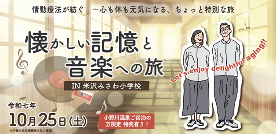 を開催。老年医学専門医による講演、懐かしの青春ソングを使った「パーソナルソング・メソッド」、和太鼓体験「EXADON」など、心と記憶を呼び覚ます“情動療法”を一日で体験できます。さらに会場近くの小野川温泉とも連携し、宿泊特典つきの観光プランもご用意しました。