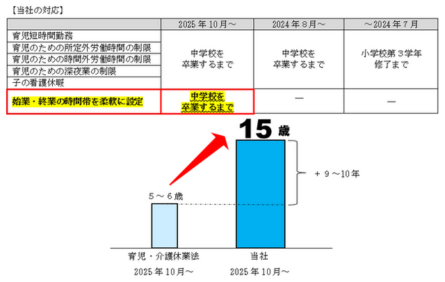 本制度は、始業・終業時刻を繰り上げ・繰り下げできる仕組みで、先行して運用している『“中学校卒業まで”の育児短時間勤務制度』と同じく、対象期間を育児・介護休業法で定められている期間を超える『中学校を 卒業するまで』とすることで、子育てと仕事の両立をより一層支援してまいります。