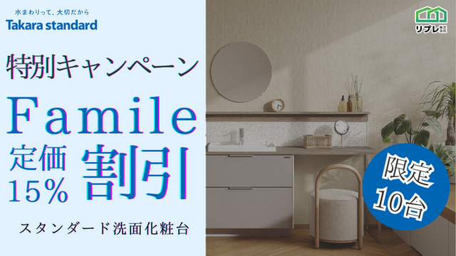 リプレ株式会社(本社:大阪市中央区、代表:古川 賢)は、タカラスタンダードの洗面化粧台「Famile(ファミーユ)」を対象とした、特別キャンペーンを実施いたします。