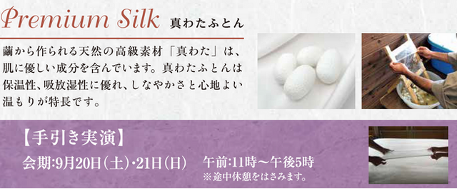 会場では、天然素材である真わたならではの肌に優しい感触やしなやかな風合い、さらに優れた放湿性・吸湿性といった特長を直接お確かめいただけます。伝統の技と素材が生み出す上質な寝具の魅力を、この機会にぜひご体験ください。