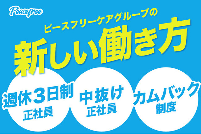 株式会社ピースフリーケアグループ(本社:大阪市、代表取締役:福田敏明、以下「当社」)は、2025年9月1日より「週休3日制正社員」「中抜け正社員」「カムバック制度」の3つの新しい働き方を導入しました。当社の採用キャッチコピー「誰かのために、自分のために、自分らしく働ける場所がここに」を体現し、求職者にとって魅力ある選択肢を広げることで既存職員の定着や採用活動を強化します。