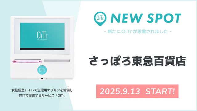 全国の商業施設や交通機関、公共施設、オフィス、学校などの女性個室トイレに、生理用ナプキンを常備・無料提供する日本初のサービス「OiTr(オイテル)」を展開するオイテル株式会社(本社:東京都新宿区、代表取締役:崎山 真)は、「トイレットペーパーのように、個室トイレに生理用品が行き届く社会」の実現を目指し、新たに「さっぽろ東急百貨店(北海道札幌市)」にOiTrを設置し、2025年9月13日よりサービスを開始しましたことをお知らせいたします。